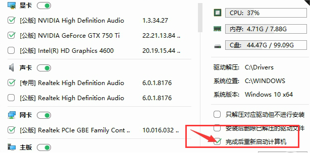 在软件界面的右下角,您会看到一个“完成后重新启动计算机”的选项。只需勾选此选项,即可在驱动安装完成后自动重启计算机。